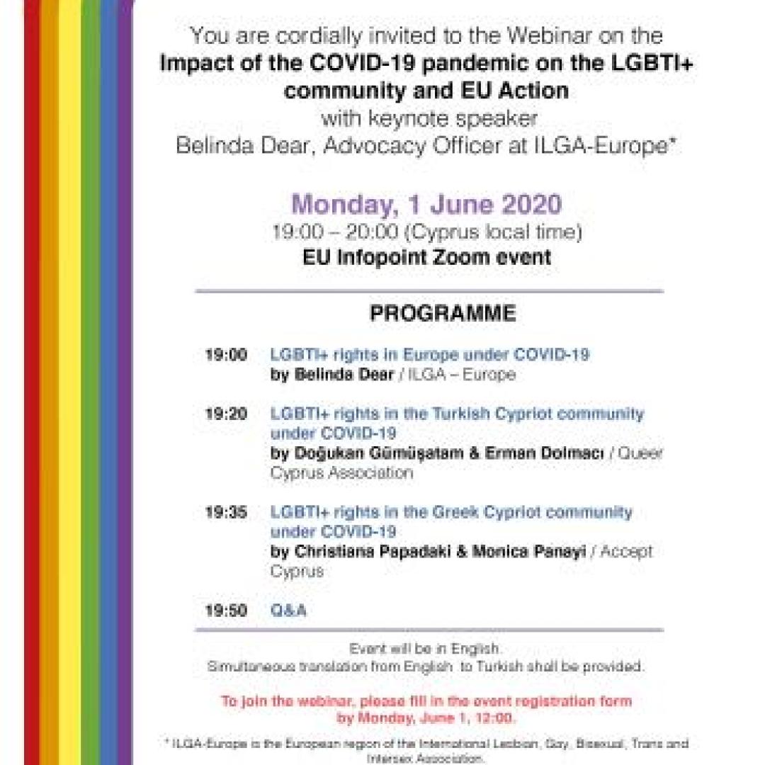 The European Commission highlighted the topic of “Impact of the COVID-19 pandemic on the LGBTI+ community and EU Action” at a webinar organised by the EU Infopoint in cooperation with ILGA-Europe, Queer Cyprus, and Accept Cyprus. The webinar was held on Monday, 1 June 2020 from 19:00 to 20:00.
